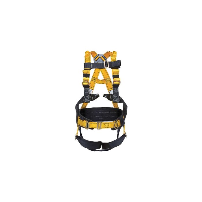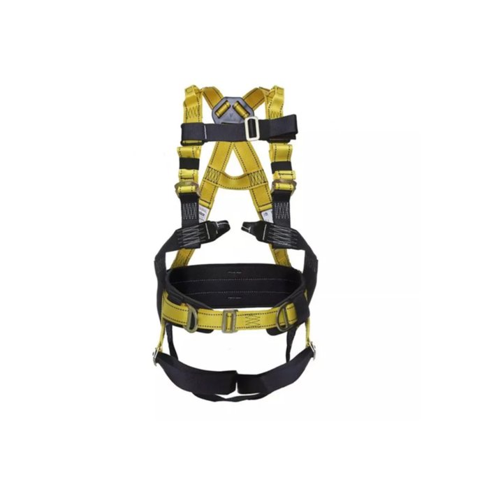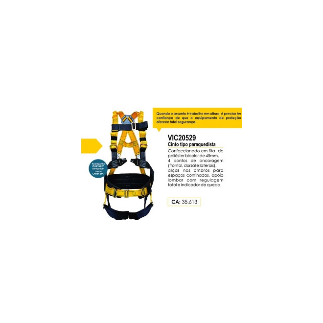 Cinturão de segurança tipo paraquedista/abdominal confeccionado em fita primária e secundária de poliéster de 45 mm, com apoio lombar, 4 pontos de ancoragem (dorsal, frontal e laterais) e fivelas em aço para regulagem. Indicador de queda e QR code para sistema de inspeção através do app MOB INSPEÇÃO.