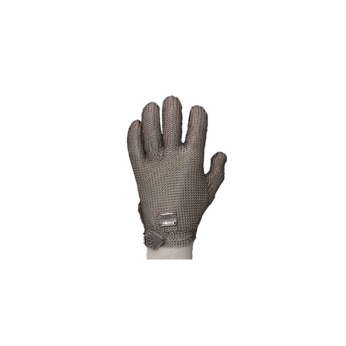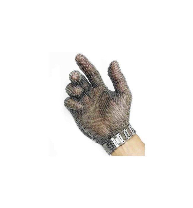 Luva de segurança confeccionada em malha de aço inoxidável, fio com diâmetro de 0,55 mm e anéis com diâmetro interno de 2,9 mm e externo de 4,0 mm com pulseira malha aço inox para fechamento e ajuste no punho, curta, cinco dedos. As luvas podem ser usadas nas duas mãos. A luva normal é fornecida para o uso na mão esquerda, mas pode ser ajustada pelo próprio trabalhador para o uso na mão direita, procedendo-se da seguinte forma: (1) inverter a luva de dentro para fora, (2) retirar o botão de pressão, soltar o parafuso e voltar a colocá-lo no verso da pulseira, (3) retirar a presilha da pulseira e voltar a fixá-la no sentido inverso. - Não é necessário tirar a pulseira das telas do tecido de metal. As luvas de proteção EUROFLEX® protegem seu usuário contra ferimentos causados por estocadas ou cortes no manejo de facas manuais e ferramentas semelhantes, particularmente nos trabalhos de desossa e trinchamento de carne ou no preparo de couro, têxteis, materiais plásticos, etc.